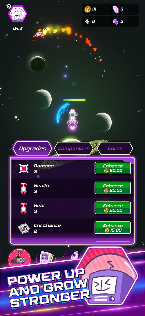Keep collecting currency to obtain power ups for your ship and companions to progress!